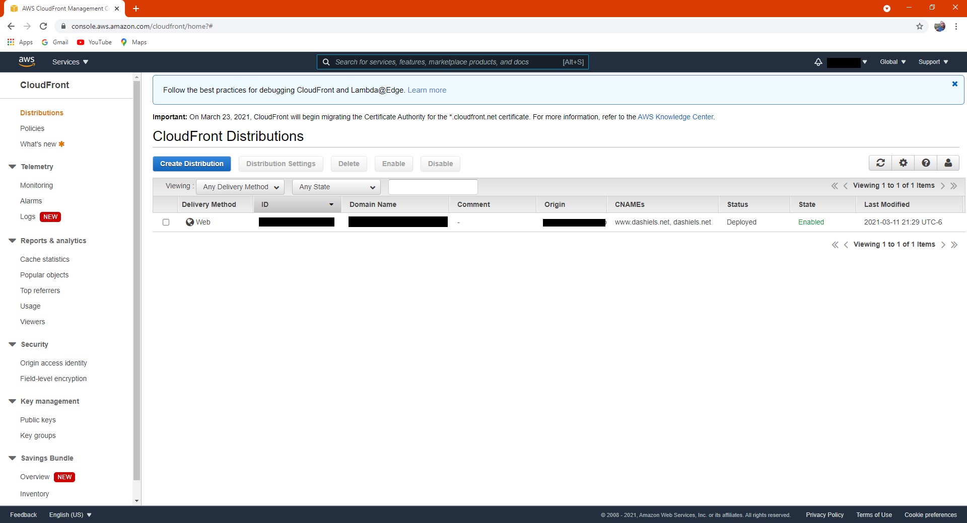 Another Amazon service I am using is Cloudfront, which allows people from anywhere to access my website. It uses HTTPS instead of HTTP.