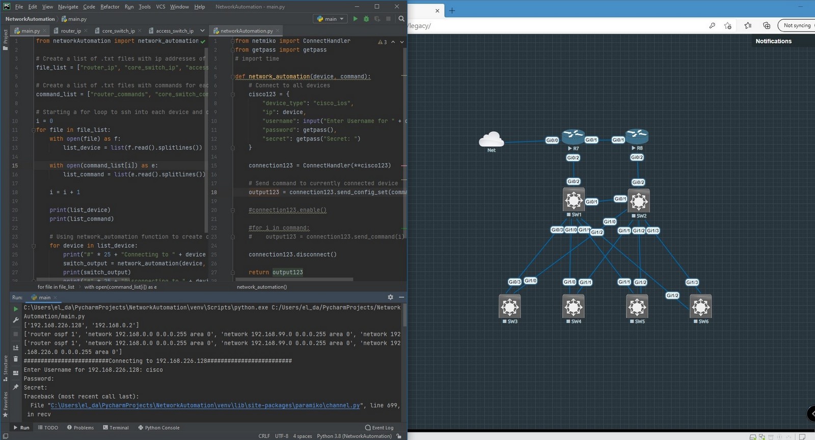 Using PyCharm as a Python IDE, I created a script with the help of the internet to send configuration the routers and switches in the topology in EVE-NG. Once the script is ran, it will prompt for the SSH password and then push the configurations to all of the networking devices. This tool in Python is called Netmiko. There is also another called Nornir that is very interesting.